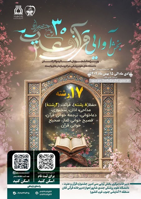 گفتنی است متقاضیان برای شرکت در سیاُمین جشنواره قرآن و عترت وزارت بهداشت میتوانند با مراجعه به سامانه جشنواره به نشانی quran.behdasht.gov.ir نسبت به ثبتنام و بارگذاری آثار خود اقدام کنند.
